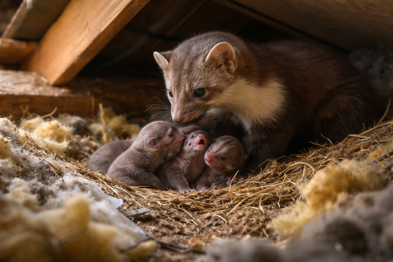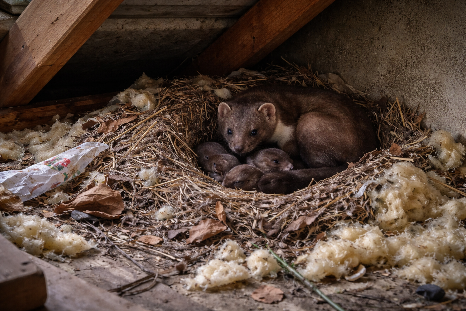 Når de først er inde, slår de sig ofte ned på loftet – et typisk tegn på mår på loftet – hvor de bruger isolering som rede og hvileplads.